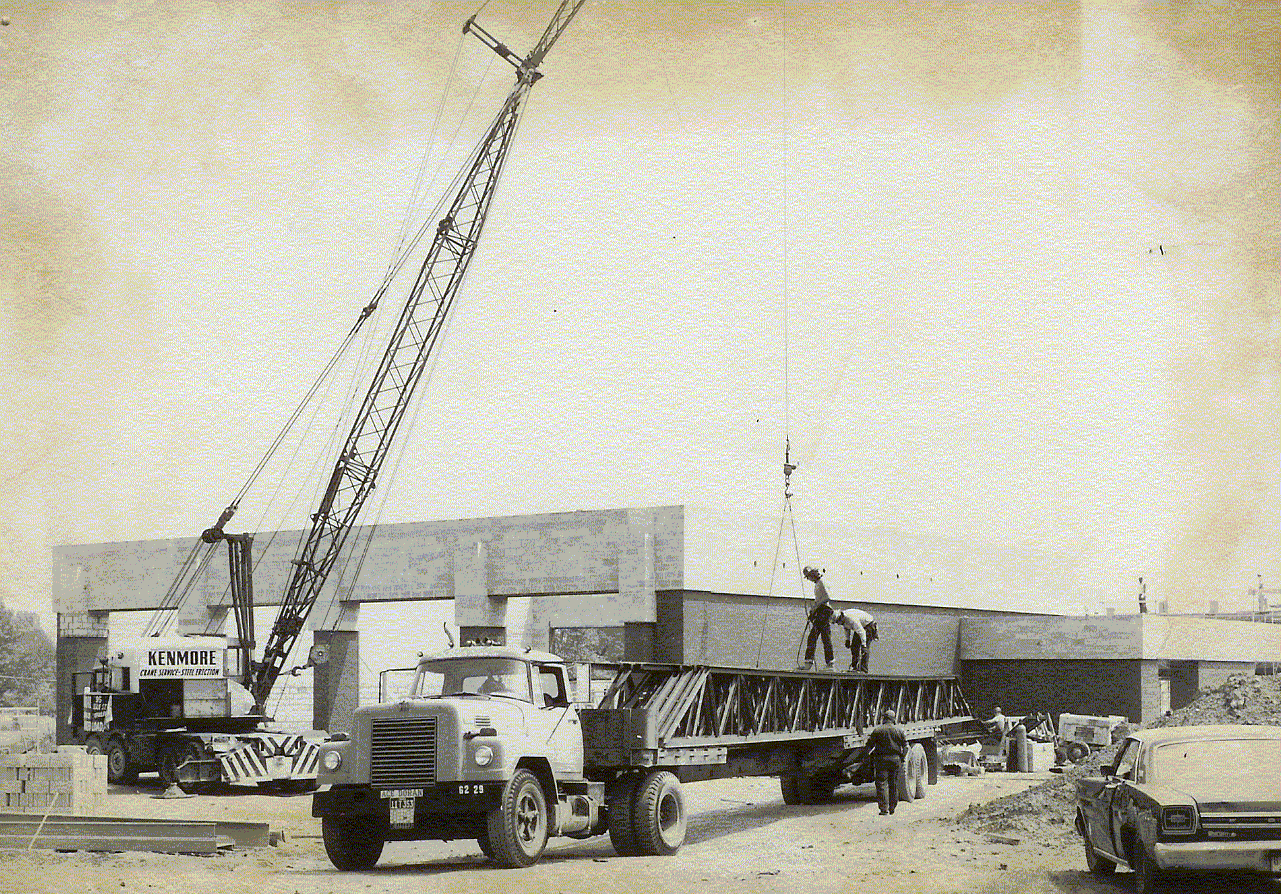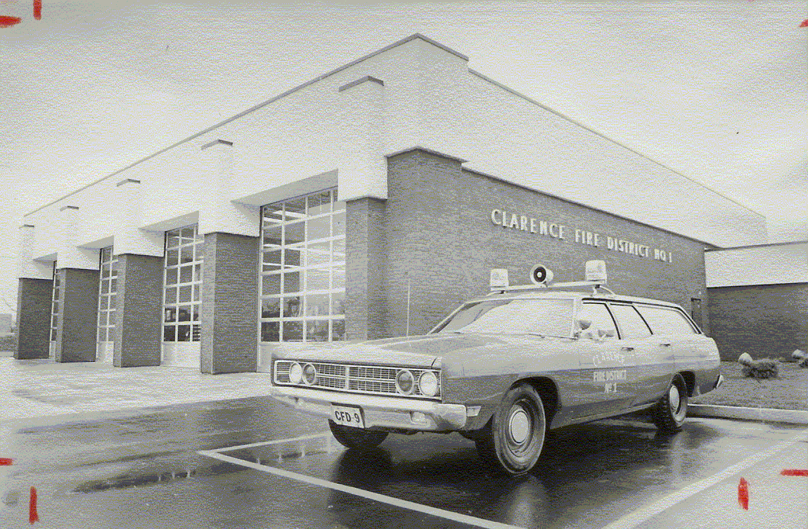 On June 19, 1954, the property owners of Clarence Fire District No. 1, voted their approval of a $38,000 bond issue to finance the building of a new fire hall. A lot, 120' by 180', located on the south side of Bodine Road, east of Parker Elementary School was purchased as the site. The architectural plans were designed by Elton F. Ransom of Clarence and work on the brick-faced concrete block building proceeded under the direction of the Gruber Construction Company. The building was completed during the summer of 1955.