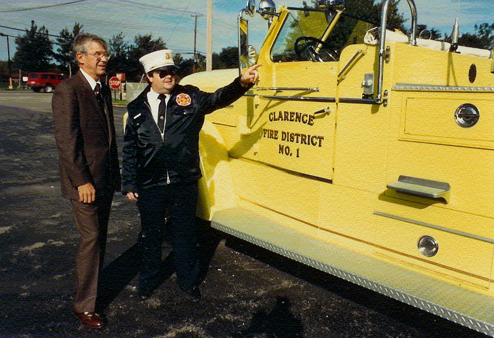 Without further delay, the new Fire Commissioners purchased a new fire engine – a 1½ ton truck upon which was installed a 440 gallon chemical tank outfit. It was an exciting day for the citizens of Clarence when that new truck arrived. Everyone gathered at the school grounds to see it demonstrated. A year later, on August 9, 1923, the first siren was purchased and shortly thereafter was installed atop the fire hall.